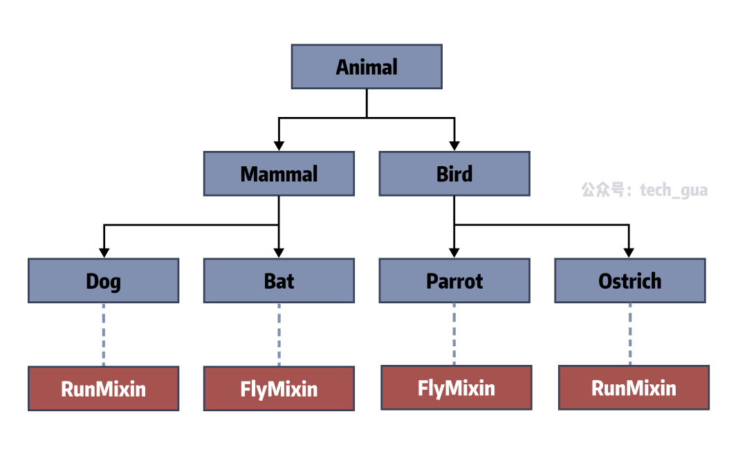 那么如果我们将 Mammal 哺乳动物和 Bird 鸟类动物封装成 Mix-in ,并将 Fly 和 Run 做成一级 class 这样可以吗?在实现上是可以的,但是并不推荐。