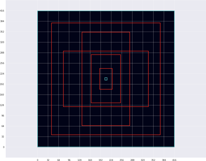 放大后,锚框看起来像上面的图像,但它们数量庞大,几乎覆盖了所有图像的区域。想了解更多有关锚框的信息,请查看这篇文章:https://medium.com/@andersasac/anchor-boxes-the-key-to-quality-object-detection-ddf9d612d4f9