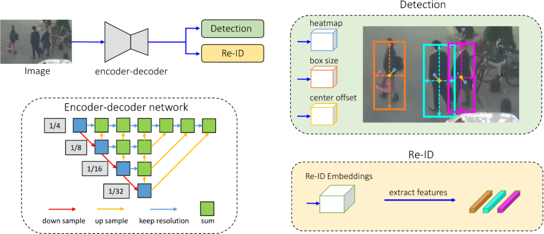 利用深度学习跟踪人分为两个分支:1)目标检测分支;2)身份嵌入分支
