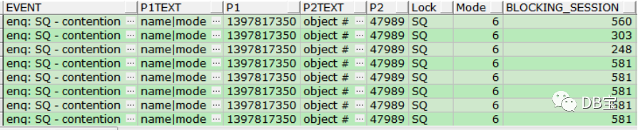 根据AWR报告的内容,基本可以断定,只要解决了“enq: SQ - contention”和“DFS lock handle”这两个等待事件即可解决问题。其实,“enq: SQ - contention”、“row cache lock”、“DFS lock handle”和“enq: SV - contention”这4个等待事件都与Oracle的序列有关,如下所示: