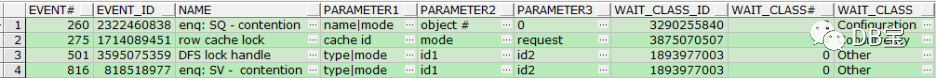 4WHERE EVENT IN ('enq: SQ - contention','DFS lock handle','enq: SV - contention');