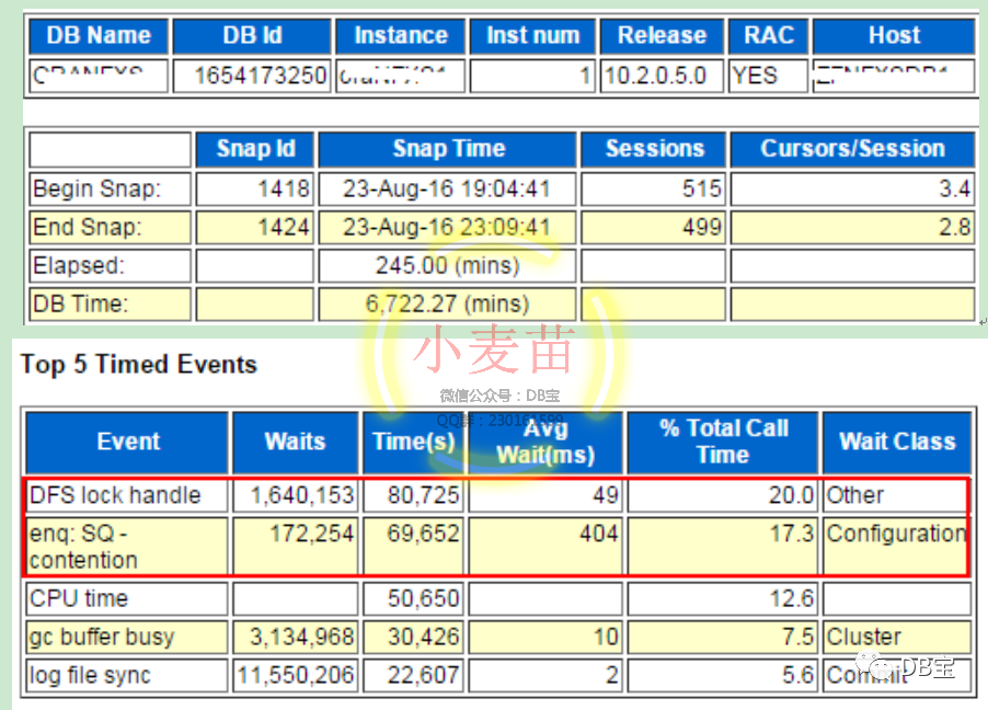 从等待事件中可以很明显地看出“enq: SQ - contention”和“DFS lock handle”这两个等待事件异常。“Top 5 Timed Events”部分也是AWR报告中非常重要的部分,从这里可以看出等待事件排在前五位的是哪些事件,从而基本上就可以判断出性能瓶颈在什么地方。在这里,“enq: SQ - contention”等待了172254次,等待时间为69652秒,平均等待时间为69652/172254=404毫秒,等待类别为Configuration即配置上的等待问题。