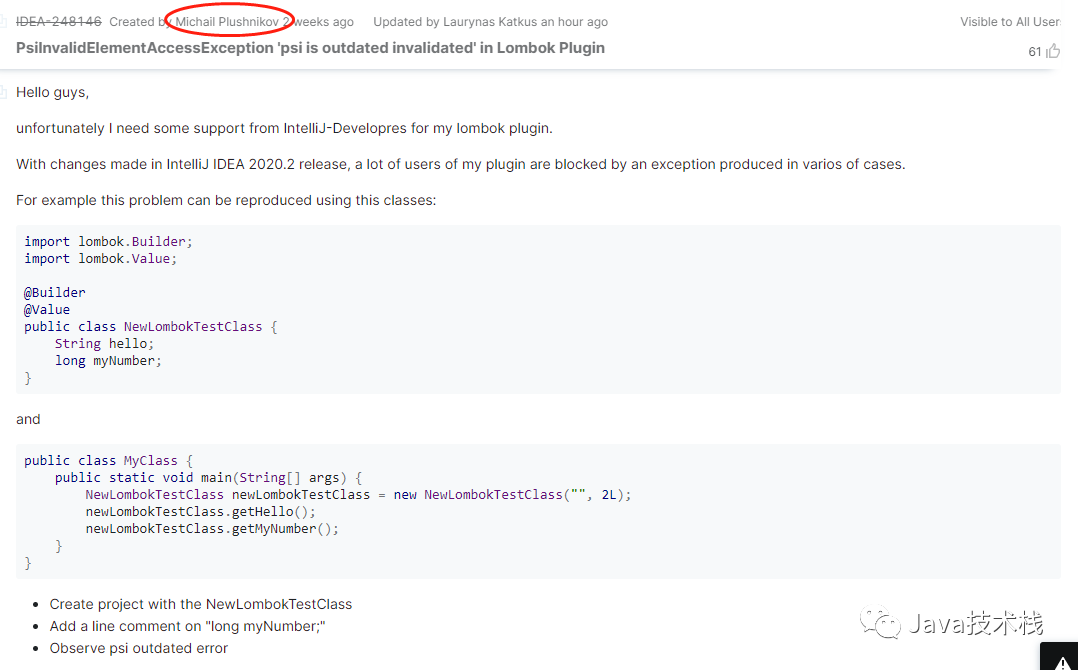 这个应该是 IntelliJ 开发者,他 @ Lombok 原作者说: