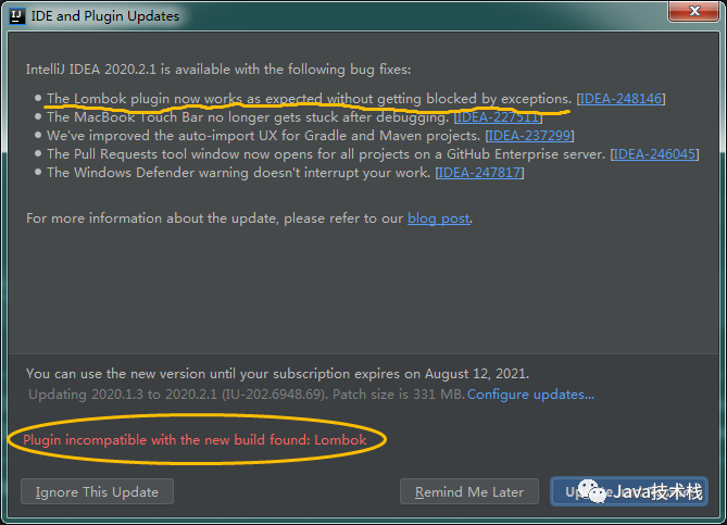 再注意看最上面的更新说明,IDEA 2020.2.1 修复了一些 bug,第一个就是关于 Lombok 的: