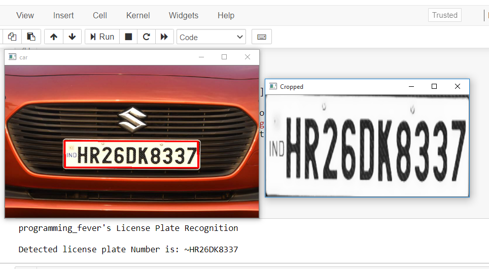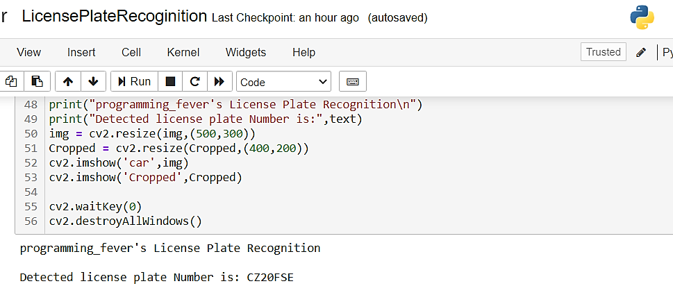 #@programming_feverimport cv2import imutilsimport numpy as npimport pytesseractpytesseract.pytesseract.tesseract_cmd = r'C:\Program Files (x86)\Tesseract-OCR\tesseract.exe'img = cv2.imread('D://skoda1.jpg',cv2.IMREAD_COLOR)img = cv2.resize(img, (600,400) )gray = cv2.cvtColor(img, cv2.COLOR_BGR2GRAY)gray = cv2.bilateralFilter(gray, 13, 15, 15)edged = cv2.Canny(gray, 30, 200)contours = cv2.findContours(edged.copy(), cv2.RETR_TREE, cv2.CHAIN_APPROX_SIMPLE)contours = imutils.grab_contours(contours)contours = sorted(contours, key = cv2.contourArea, reverse = True)[:10]screenCnt = Nonefor c in contours:peri = cv2.arcLength(c, True)approx = cv2.approxPolyDP(c, 0.018 * peri, True)if len(approx) == 4:screenCnt = approxbreakif screenCnt is None:detected = 0print ("No contour detected")else:detected = 1if detected == 1:cv2.drawContours(img, [screenCnt], -1, (0, 0, 255), 3)mask = np.zeros(gray.shape,np.uint8)new_image = cv2.drawContours(mask,[screenCnt],0,255,-1,)new_image = cv2.bitwise_and(img,img,mask=mask)(x, y) = np.where(mask == 255)(topx, topy) = (np.min(x), np.min(y))(bottomx, bottomy) = (np.max(x), np.max(y))Cropped = gray[topx:bottomx+1, topy:bottomy+1]text = pytesseract.image_to_string(Cropped, config='--psm 11')print("programming_fever's License Plate Recognition\n")print("Detected license plate Number is:",text)img = cv2.resize(img,(500,300))Cropped = cv2.resize(Cropped,(400,200))cv2.imshow('car',img)cv2.imshow('Cropped',Cropped)cv2.waitKey(0)cv2.destroyAllWindows()