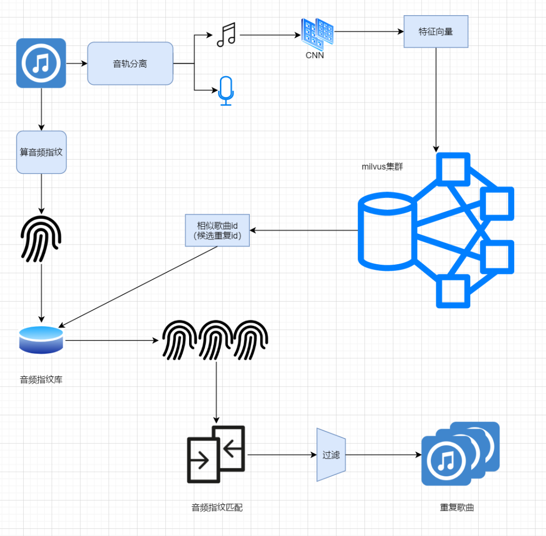 我们的思路同样是通过筛选相似的歌曲特征向量来实现,首先对音乐做音轨分离,然后基于 Milvus 召回一定量级的相似歌曲。为了实现重复歌曲的精准筛选,我们会提取音乐的音频指纹(比如