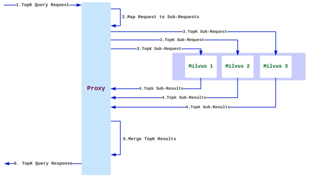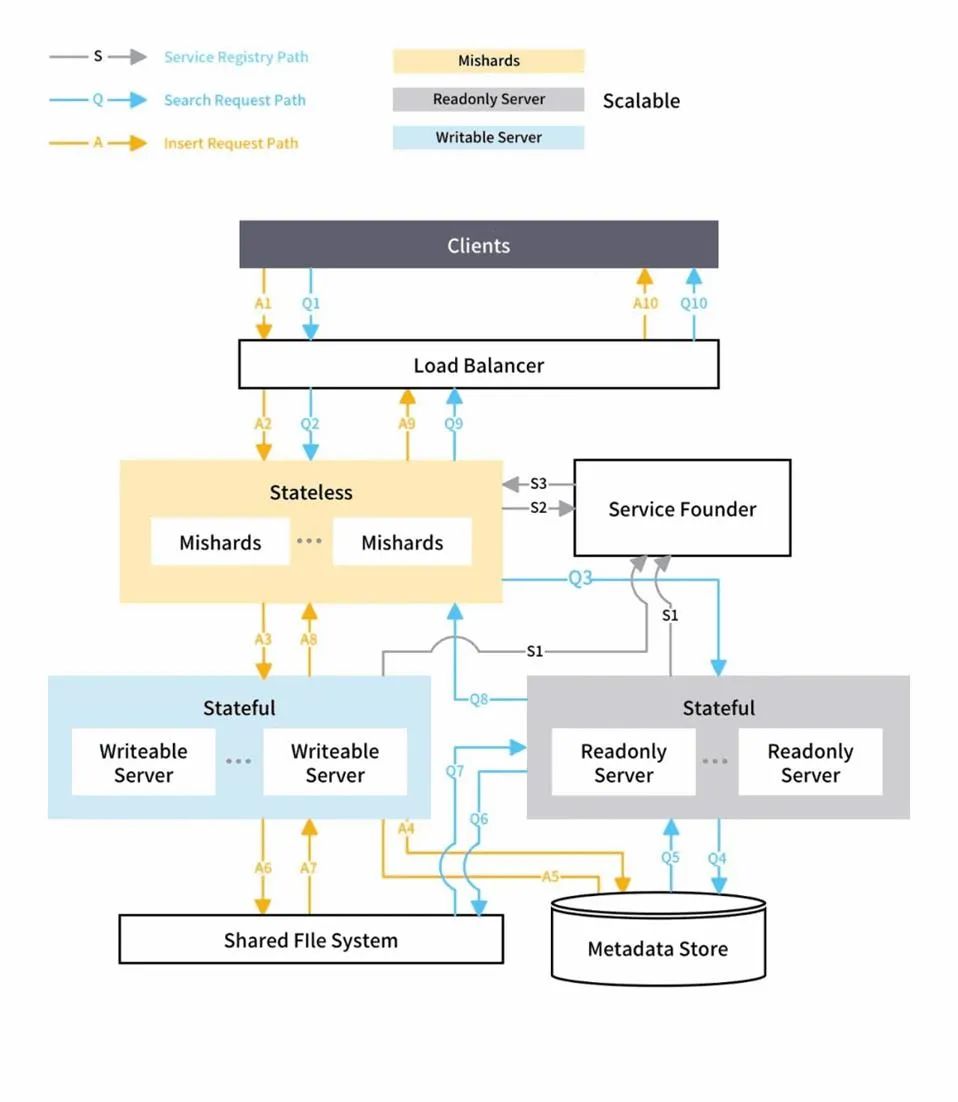 Mishards 将上游过来的请求拆分,然后路由到子服务。子服务完成后,将各子服务查询结果汇总,返回给上游。其集群方案架构如下图: