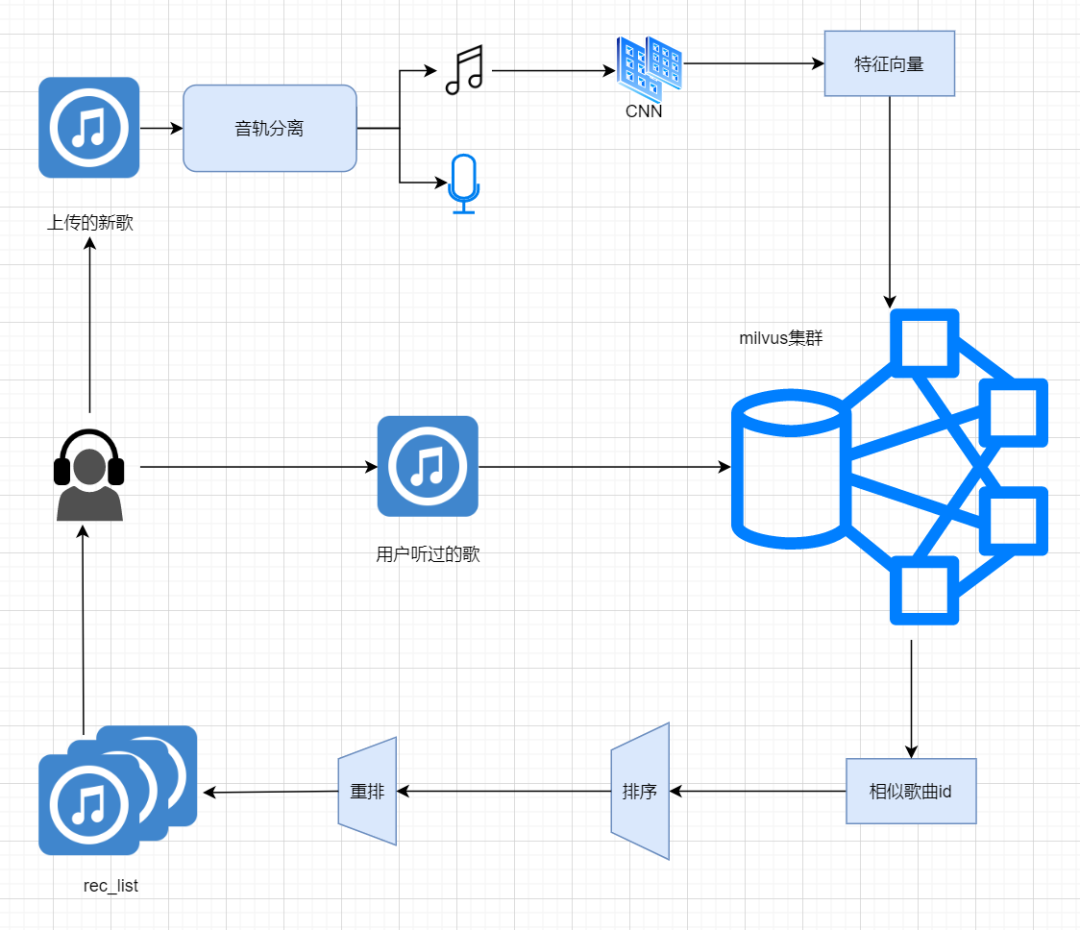 前面已经介绍了丸音的 I2I 音乐推荐系统从歌曲本身下手,首先会将用户上传的新歌做音轨分离,也就是把人声(Vocal)和伴奏(BGM)分开,提取伴奏中的特征向量作为该歌曲的表征(音轨分离也基本解决了翻唱过滤需求),然后将这些特征向量存入 Milvus,然后基于用户听过的歌在 Milvus 中召回相似歌曲,再经过排序和重排实现音乐推荐,具体实现流程如下图: