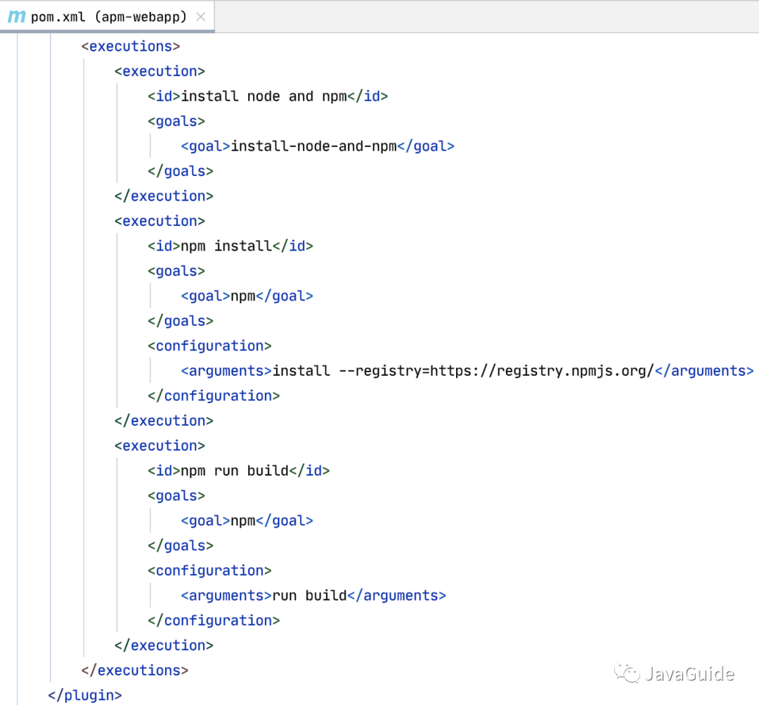因为有些项目里面包含前端项目(例如 Skywalking-ui),并且前端使用了 node 技术,则建议用淘宝镜像加速,在这个案例中,如下 skywalking/apm-webapp 模块中代码如下: