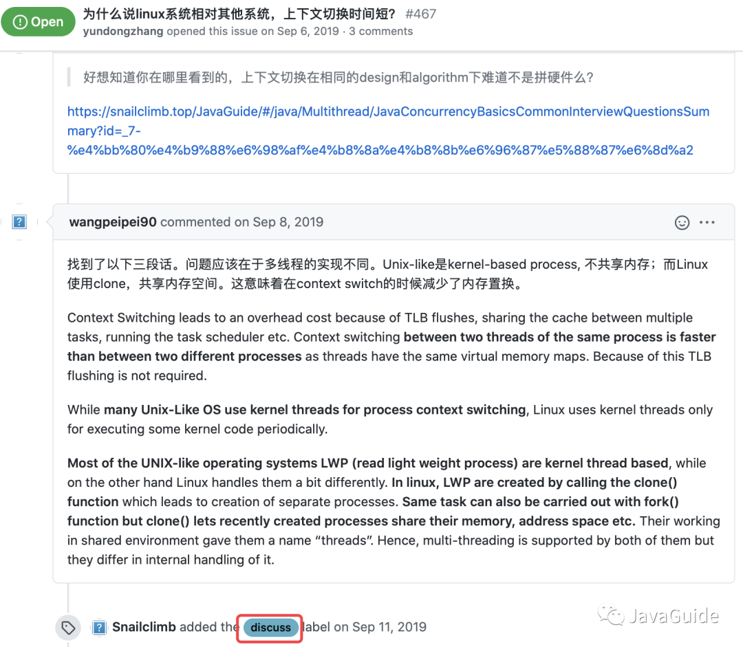 一般 Issue 提出后,都会有相关的人做讨论和交流。以 JavaGuide 举例,里面有些 Issue 讨论也可以学到很多的东西的,如下: