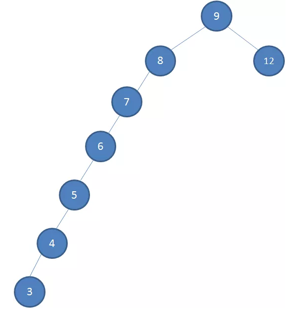 当二叉树插入数值不均衡时,会出现树结构的变形与查找性能的损耗,比如现在二叉树有8,9,12三个值,然后需要插入7,6,5,4,3这五个值时,产生的结构如下图所示: