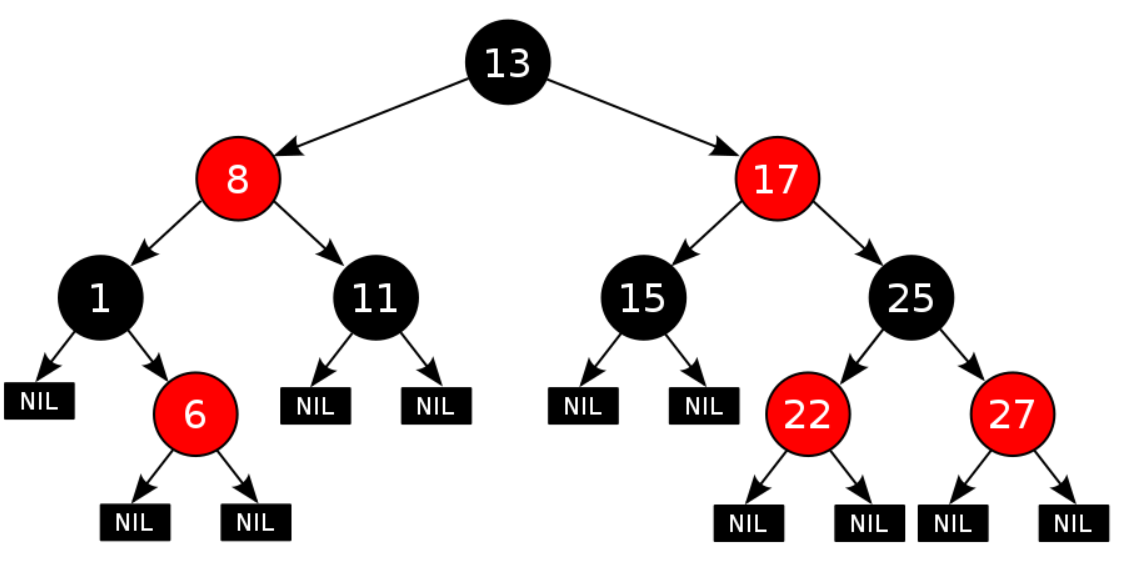 4、每个红色节点必须有两个黑色的子节点。(不能有两个连续的红色节点。)