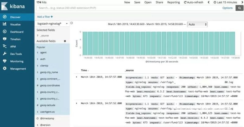 /usr/local/logstash/bin/logstash -f nginx.conf{"httpversion"=> "1.1","verb" =>"GET","auth"=> "-","@timestamp"=> 2019-03-18T06:41:27.000Z,"type"=> "nginxlog","json"=> {},"source"=> "/var/log/nginx/newtest-msp-api.mingongge.com.cn-80.log","fields" =>{"log_topics"=> "nginxlog"},"response"=> "200","offset"=> 957434,"host"=> {"name" =>"test-kafka-web"},"beat"=> {"hostname"=> "test-kafka-web","version"=> "6.3.2","name"=> "test-kafka-web"},"bytes"=> "673","request"=> "/user/fund/113","timestamp"=> "18/Mar/2019:14:41:27 +0800","referrer"=> "\"-\"","userAgent"=> {"os"=> "Windows","major" => "4","patch"=> "3","build"=> "","minor"=> "0","os_name"=> "Windows","device"=> "Other","name"=> "Electron"},"geoip"=> {"ip" => "1xx.2xx.72.175","country_name" => "China","coordinates" => [[0] 121.4012,[1] 31.0449],"region_name" => "Shanghai","location" => {"lat"=> 31.0449,"lon"=> 121.4012},"continent_code" => "AS","timezone" => "Asia/Shanghai","longitude" => 121.4012,"city_name" => "Shanghai","country_code2" => "CN","region_code" => "SH","latitude" => 31.0449,"country_code3" => "CN"},"@version"=> "1","clientip"=> "1xx.2xx.72.175","ident"=> "-","agent"=> "\"Mozilla/5.0 (Windows NT 10.0; Win64; x64) AppleWebKit/537.36(KHTML, like Gecko) sun/1.5.6 Chrome/69.0.3497.106 Electron/4.0.3Safari/537.36\""}