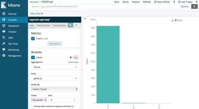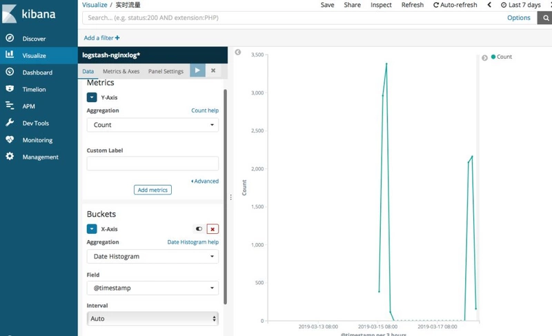 - 实时流量:根据@timestamp字段来展示单位时间的请求数(可根据异常峰值判断是否遭遇攻击)