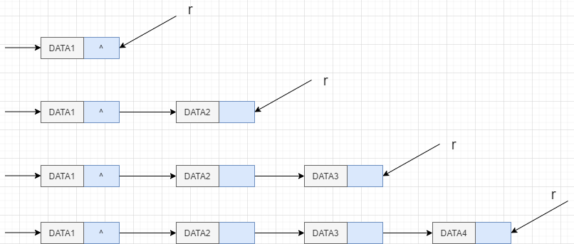 该方法是将新结点逐个插入到当前链表的表尾上,为此必须增加一个尾指针r, 使其始终指向当前链表的尾结点,代码如下: