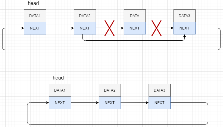 如下图所示,循环单链表的删除操作是先找到需要删除的结点,将其前一个结点的next指针直接指向删除结点的下一个结点即可。