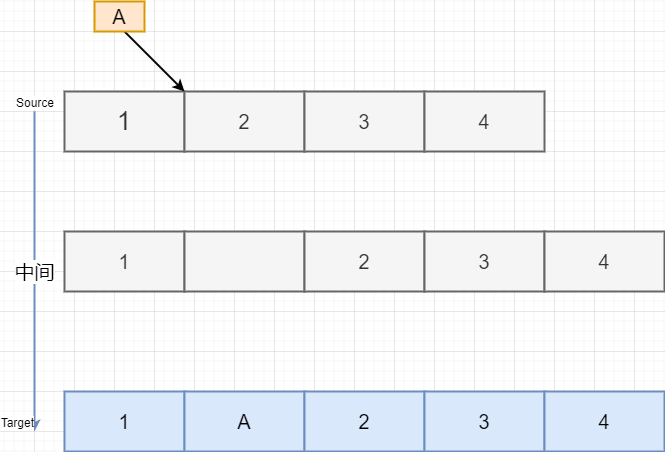 以C语言数组插入一个元素为例,当我们需要在一个数组{1,2,3,4}的第1个元素后的位置插入一个’A’时,我们需要做的有: