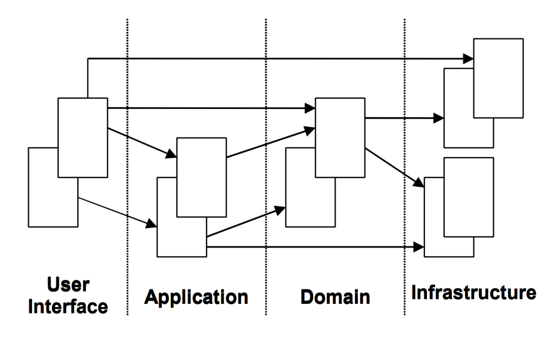 按照这个分层,越往左边代码变动越频繁。随着业务复杂,应用层和领域层的边界变得模糊,领域之间也容易交错在一起。