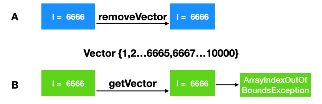 如果线程 A 在包含这么多元素的基础上调用 getVector 方法,会得到一个数值,getVector 只是取得该元素,而并不是从 vector 中移除,removeVector 方法是得到一个元素进行移除,这段代码的不安全因素就是,因为线程的时间片是乱序的,而且 getVector 和 removeVector 并不会保证互斥,所以在 removeVector 方法把某个值比如 6666 移除后,vector 中就不存在这个 6666 的元素,此时 getVector 方法取得 6666 ,就会抛出数组越界异常。为什么是数组越界异常呢?可以看一下 vector 的源码