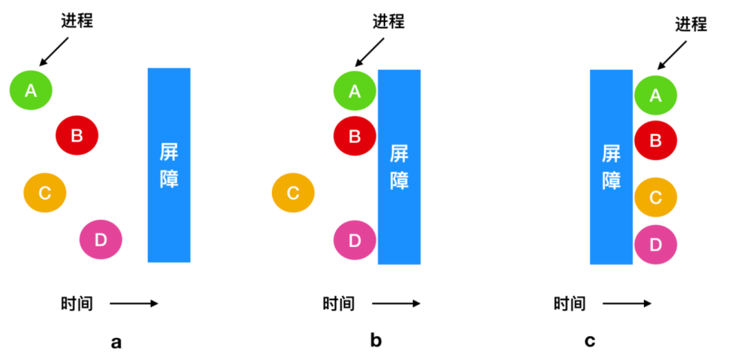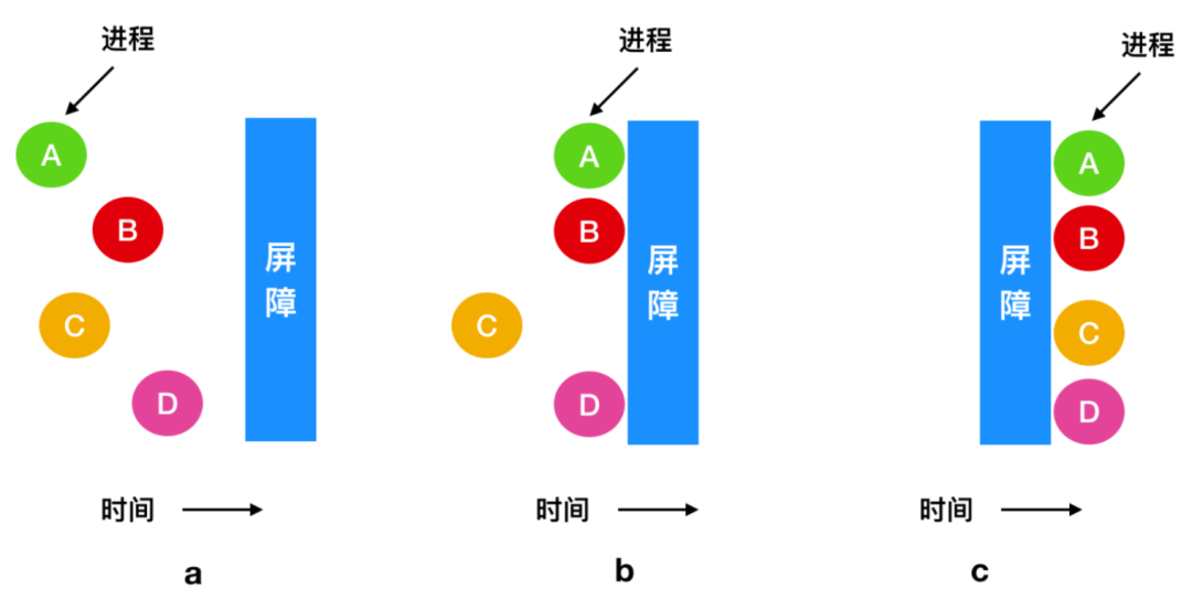 Barrier 的特点和闭锁也很类似,它也是阻塞一组线程直到某个事件发生。栅栏与闭锁的区别在于,所有线程必须同时到达栅栏的位置,才能继续执行,就像我们上面操作系统给出的这幅图一样。