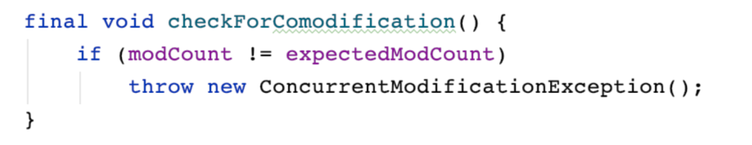 该段代码会发生异常,因为在 ArrayList 内部,有两个属性,一个是 modCount ,一个是 expectedModCount ,ArrayList 在 remove 等对集合结构的元素造成数量上的操作会有 checkForComodification 的判断,如下所示,这也是这段代码的错误原因。