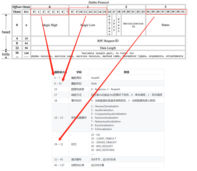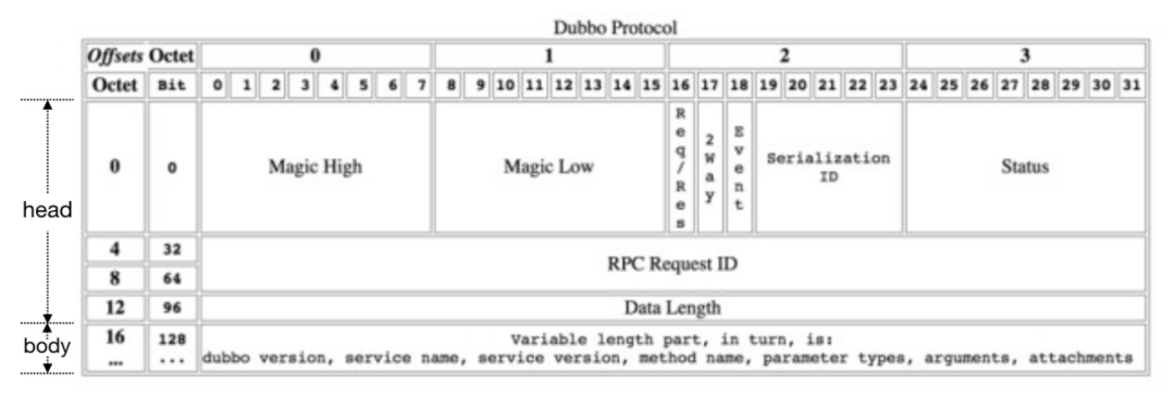 可以看到 Dubbo 数据包分为消息头(head)和消息体(body)。