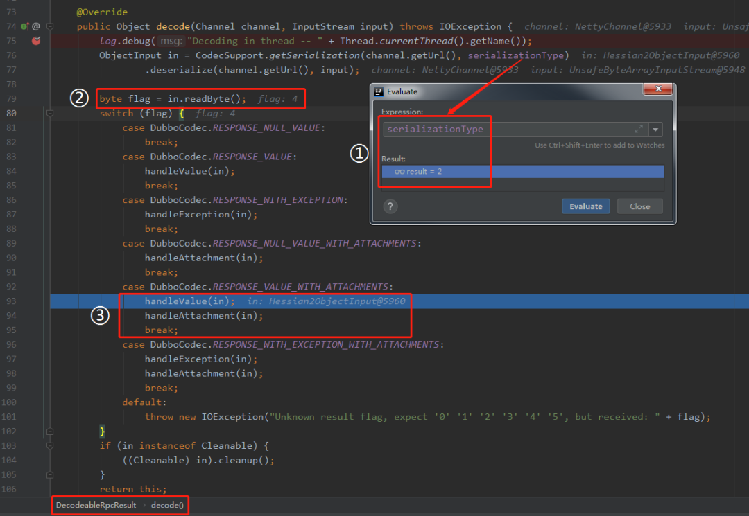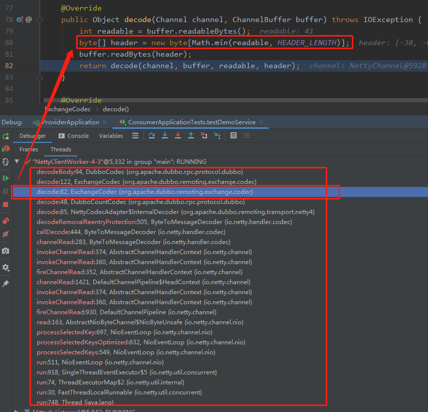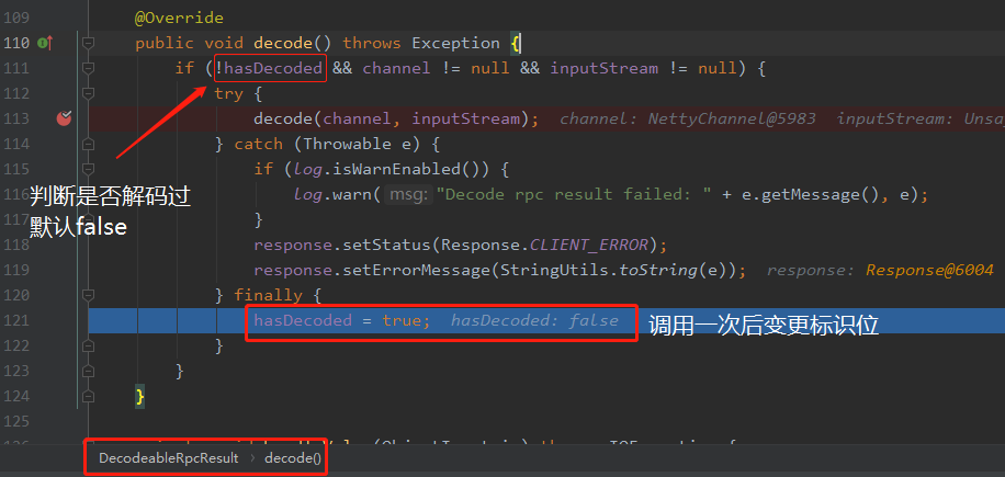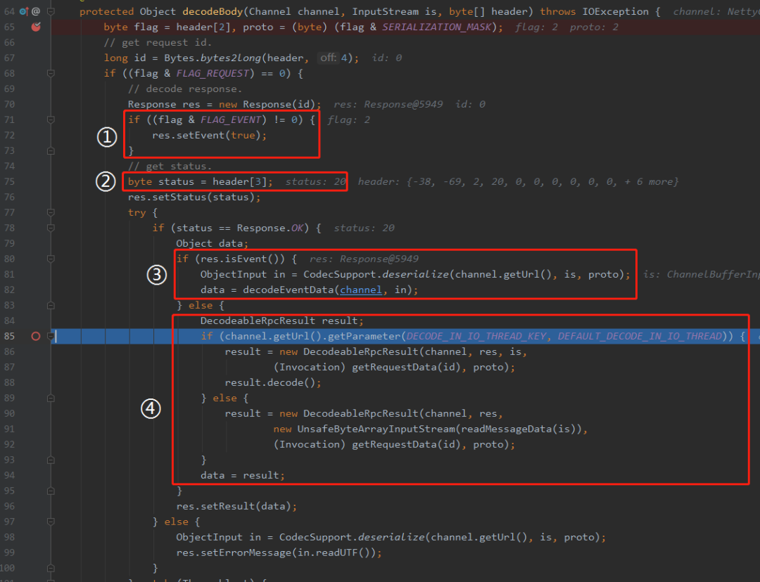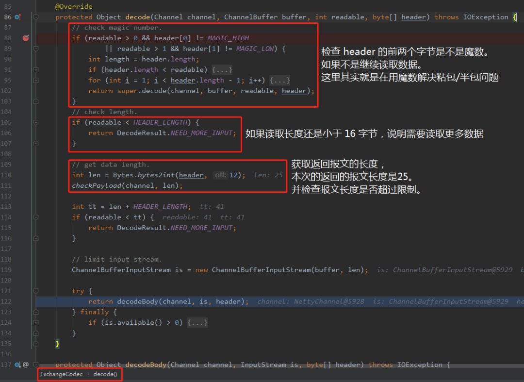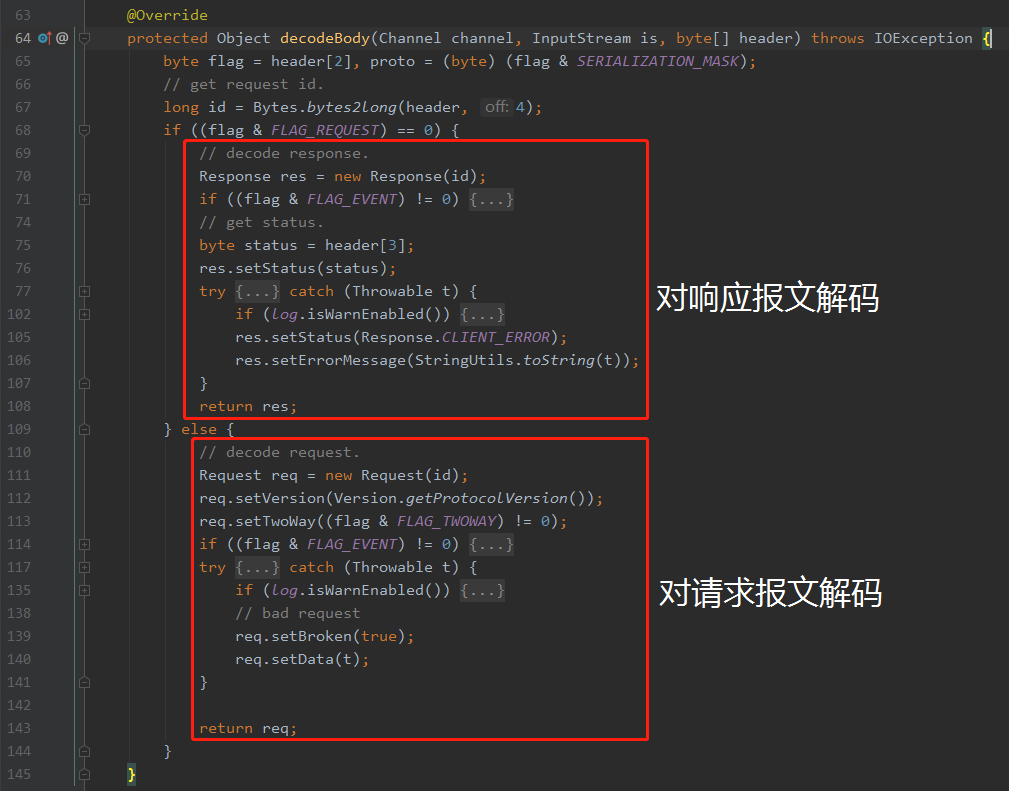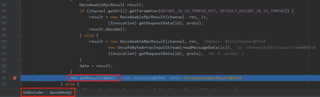 解的是响应报文的响应体,也就是我们的返回内容:org.apache.dubbo.rpc.protocol.dubbo.DecodeableRpcResult#decode(org.apache.dubbo.remoting.Channel, java.io.InputStream)