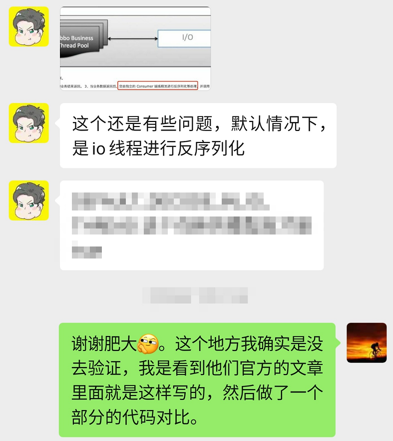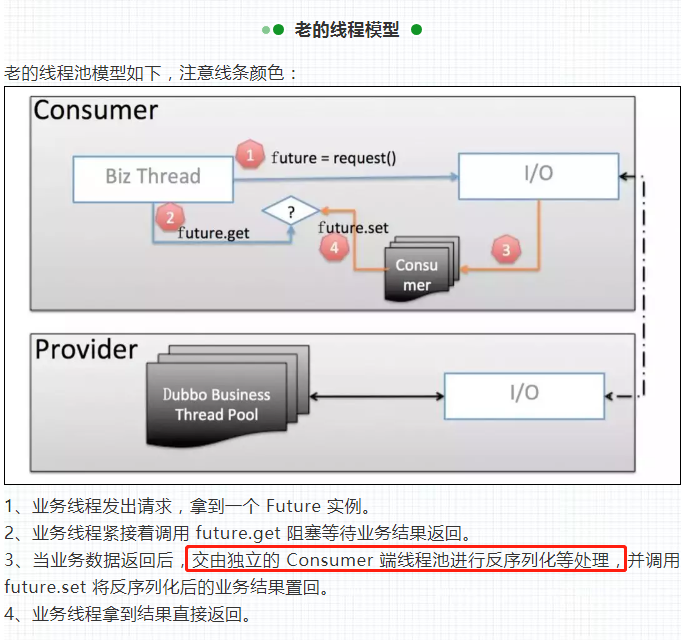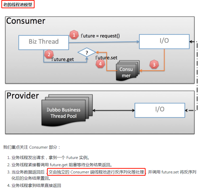 正确的说法应该是:在老的(2.7.5 版本之前)线程池模型中,当业务数据返回后,默认在 IO 线程上进行反序列化操作,如果配置了 decode.in.io 参数为 false(默认为 true),则延迟到独立的客户端线程池进行反序列化操作。