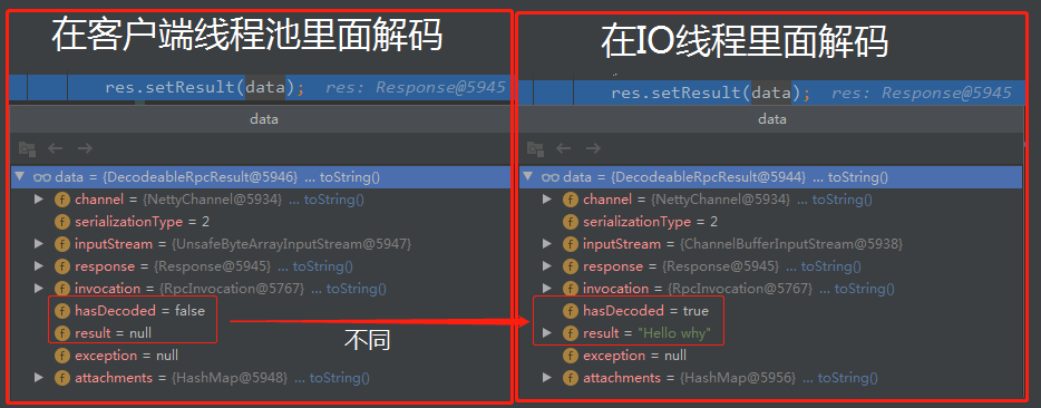 接下来,我给大家对比一下 decodeBody 方法在 IO 线程里面解码和在客户端线程池里面解码时分别返回什么。也就是这行代码返回的时候: