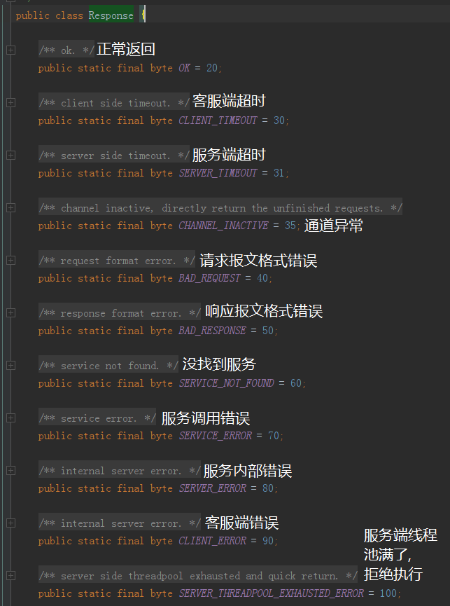 状态里面有个省略号,说明没有枚举完。但是代码里面肯定是齐的,这些状态对应的代码在这个类里面,一共 11 个,给大家补充完整:org.apache.dubbo.remoting.exchange.Response