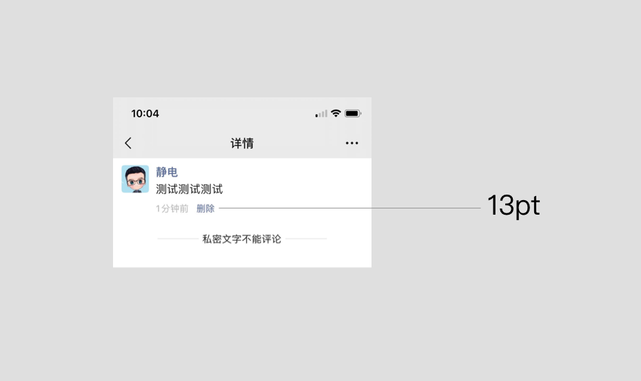但是随着sketch等矢量UI工具的普及,大家普遍开始使用1倍图来进行设计,那么此时,不管你设置多大的字号,开发工程师最终设置的代码也是一样的。字体为12px,那么开发就写12pt,整个换算是1:1进行的。所以此时你不管用任何数值来进行字号设置,都没有问题。(典型的例子为微信:微信朋友圈的删除按钮为13pt,并不是偶数。)
