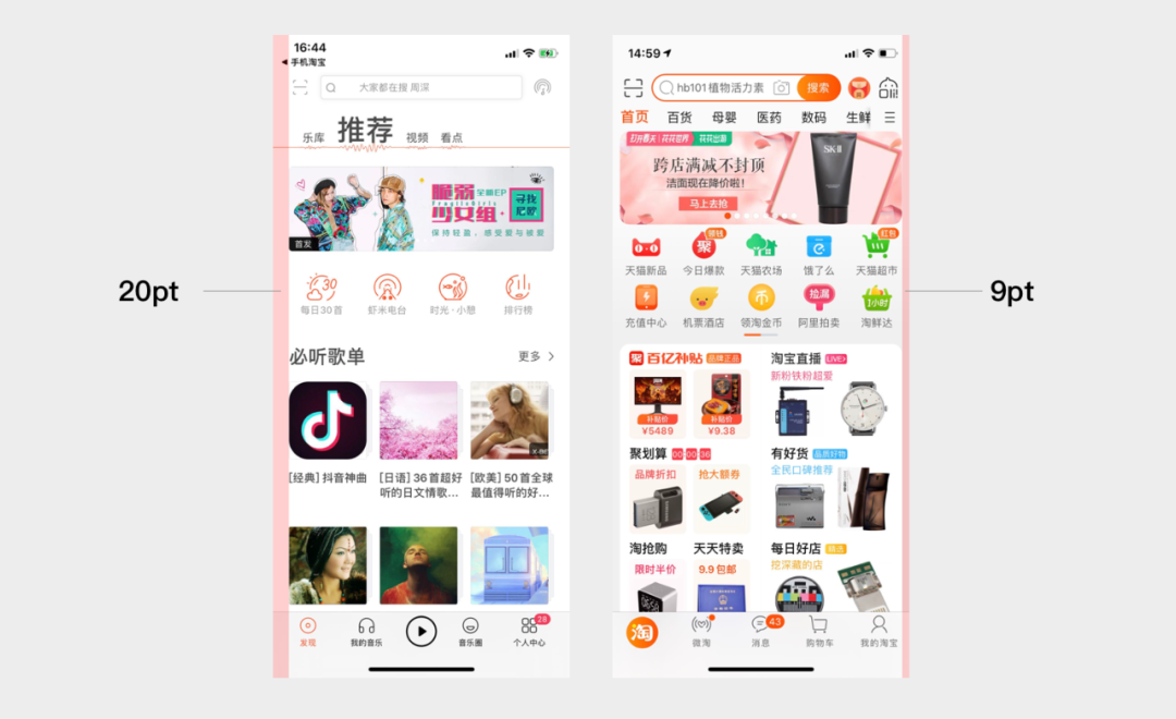A:没有。这个只是大家的一个经验值,一般来说,页面左右留出一定间距会让页面有呼吸感,不至于太挤。这个经验值,我个人的经验值,最小留白为8-10,最大随意,跟随设计风格走。如下图所示,虾米音乐强调个性,留白偏大,达到了20pt,而淘宝内容更丰富,强调内容呈现,所以只有9pt。