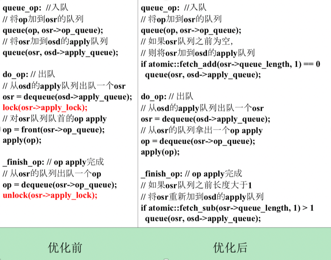 对于Ceph filestore存储引擎,同一个pg的op需要串行apply。每个pg有一个OpSequencer(简称osr),用于控制apply顺序,每个osr有一个apply lock以及一个op队列。对于每个待apply的op,首先加入对应pg的osr的队列,然后把osr加到filestore的负责apply的线程池op_tp的队列,简称为apply队列。op_tp线程从apply队列中取出一个osr,加上它的apply lock,再从osr的队列里取出一个op apply,逻辑代码如下图左所示。可见,每个op都会把其对应的osr加入到apply队列一次。如果多个op是针对同一个pg的对象,则这个pg的osr可能多次加入到apply队列。如果apply队列中连续两个osr是同一个pg的,也就是同一个osr,则前一个op被一个线程进行apply时,osr的apply lock已经加锁,另一个线程会在该osr的apply lock上阻塞等待,降低了并发度。