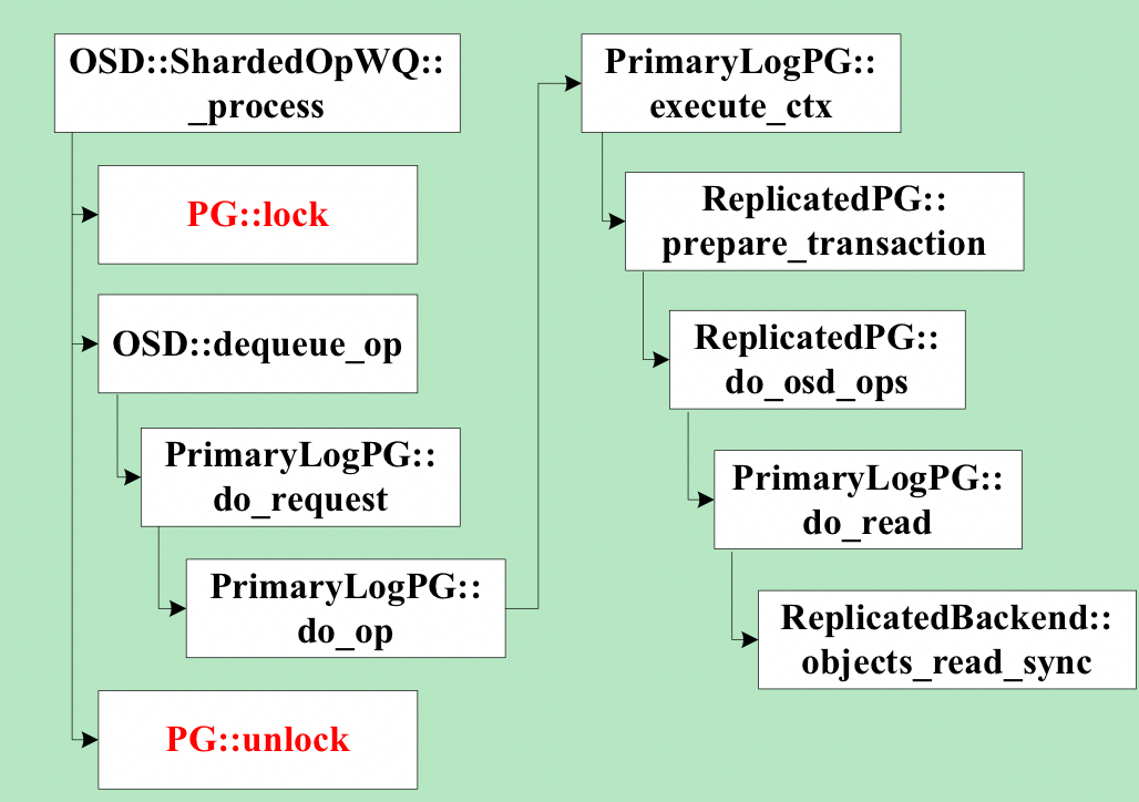 Ceph的osd处理客户端请求的线程池为osd_op_tp,在处理操作请求的时候,线程会先锁住操作对应pg的lock。其中,处理对象读请求的代码如下图所示,在锁住对象所属pg的lock后,对于最常用的多副本存储方式,线程会同步进行读操作,直到给客户端发送返回的数据后,才会释放pg lock。