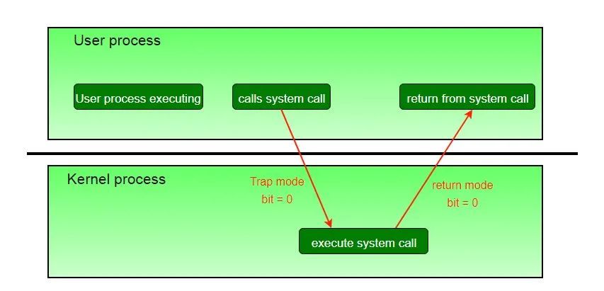 这种权限的控制核心都是由内核进行,用户态程序申请访问内核资源的时候,通常是通过软件中断的形式实现,这会导致硬件的中断处理程序将控制权转移到作为操作系统一部分的适当的中断处理程序上,在进程中将模式位转换为内核模式。中断处理程序检查生成了哪个中断,如果合适,检查附加参数(通常通过寄存器传递),然后调用适当的内核服务例程来处理系统调用请求的服务。