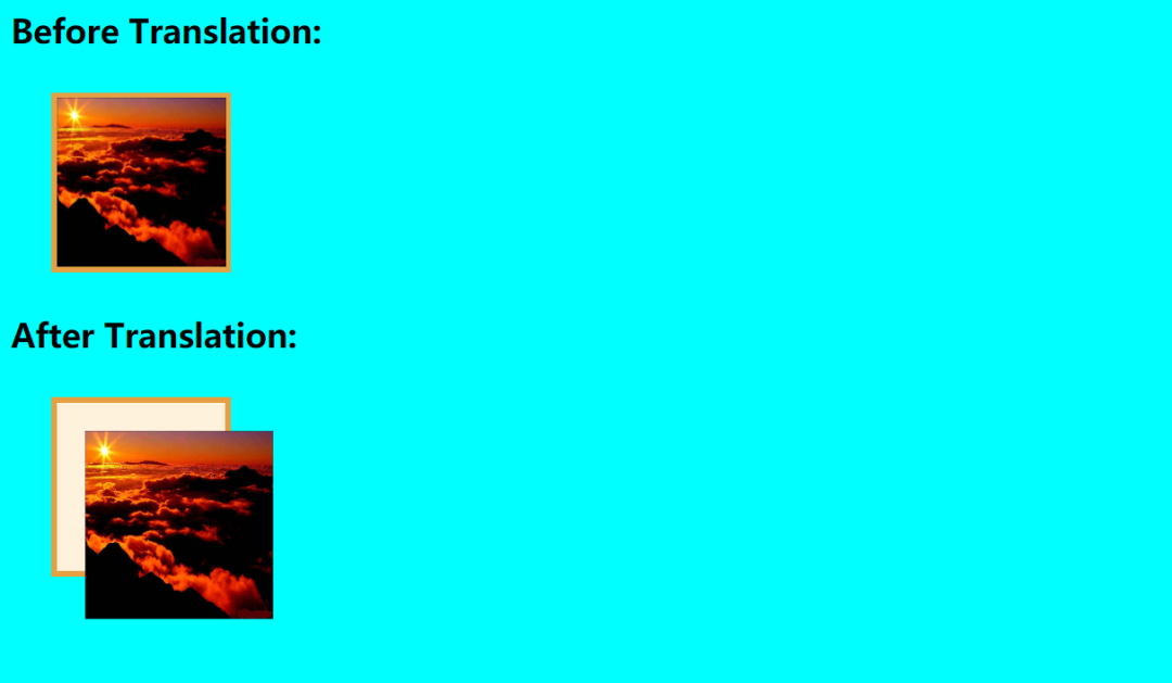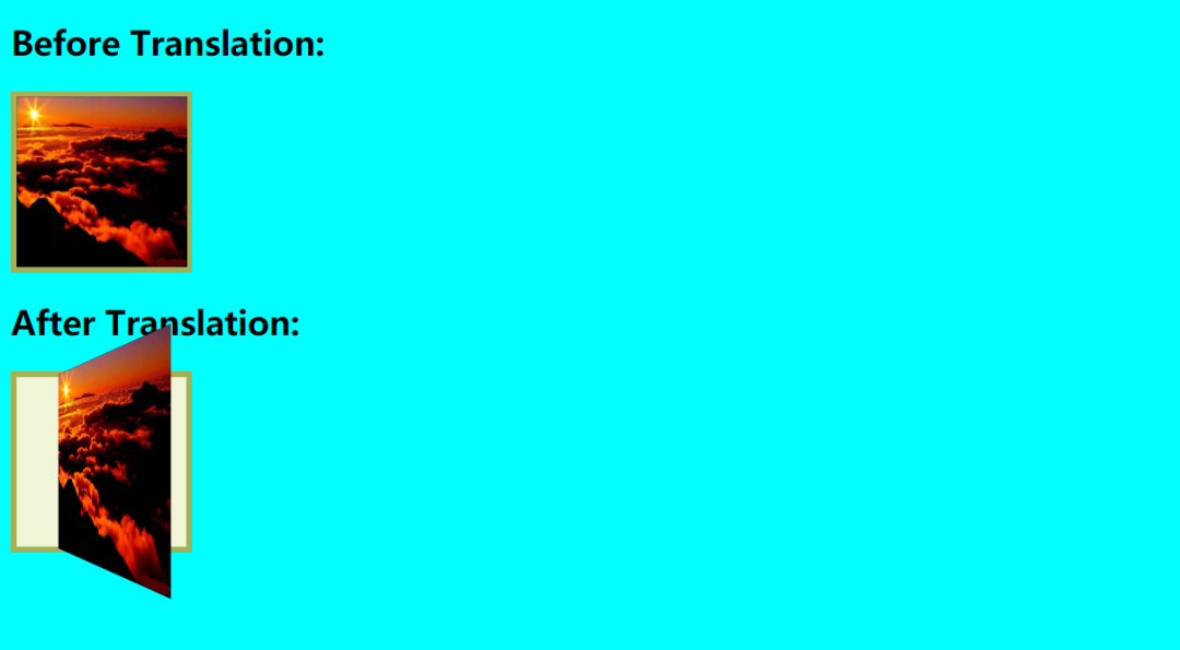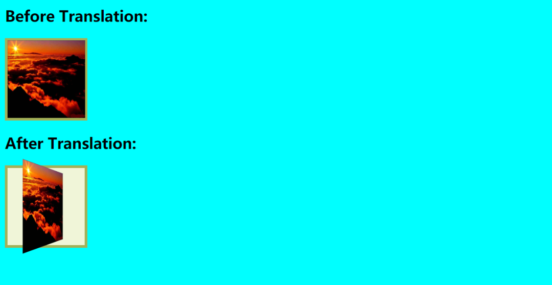 <html><head><meta charset="utf-8"><title>项目</title><style>.container {width: 125px;height: 125px;perspective: 500px;border: 4px solid #e5a043;background: #fff2dd;}.transformed {-webkit-transform: translate3d(25px, 25px, 50px);/* Chrome, Safari, Opera */transform: translate3d(25px, 25px, 50px);}img {width: 125px;height: 125px;}</style></head><body style="background-color: aqua;"><h2>Before Translation:</h2><div class="container"><img src="timg.jpg" alt="Diamond Card"></div><h2>After Translation:</h2><div class="container"><img src="timg.jpg" class="transformed" alt="Diamond Card"></div></body></html>