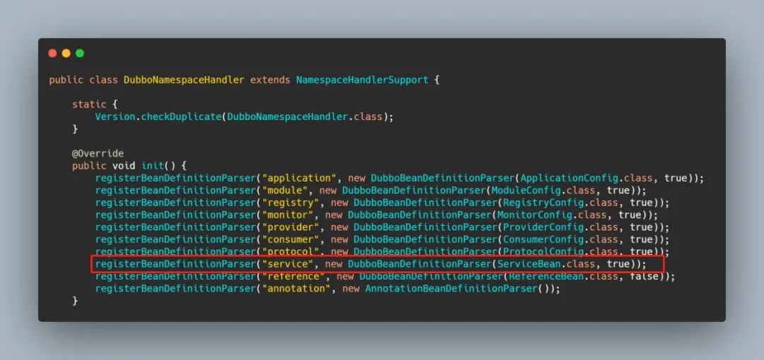 我们再来看一下 DubboNamespaceHandler 都干了啥。