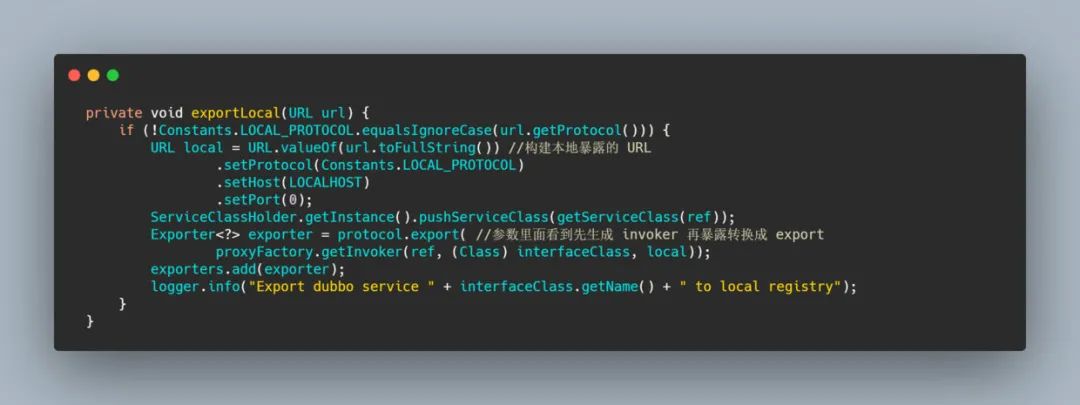 我们再来看一下 exportLocal 方法,这个方法是本地暴露,走的是 injvm 协议,可以看到它搞了个新的 URL 修改了协议。