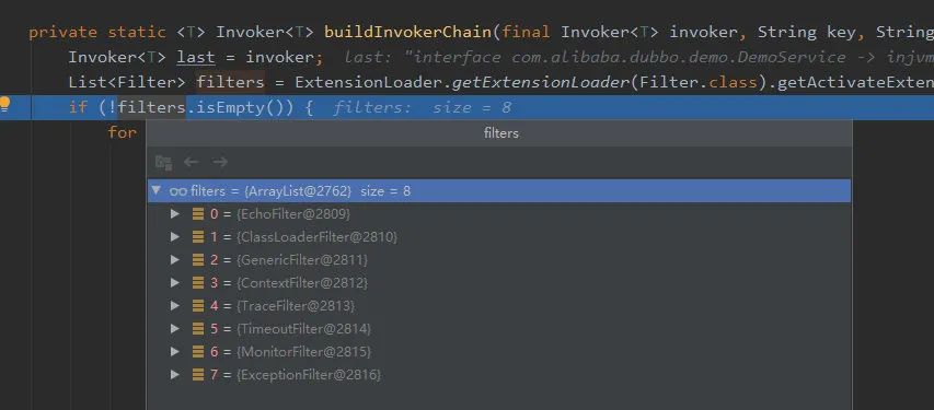 而在 ProtocolFilterWrapper 的 export 里面就会把 invoker 组装上各种 Filter。