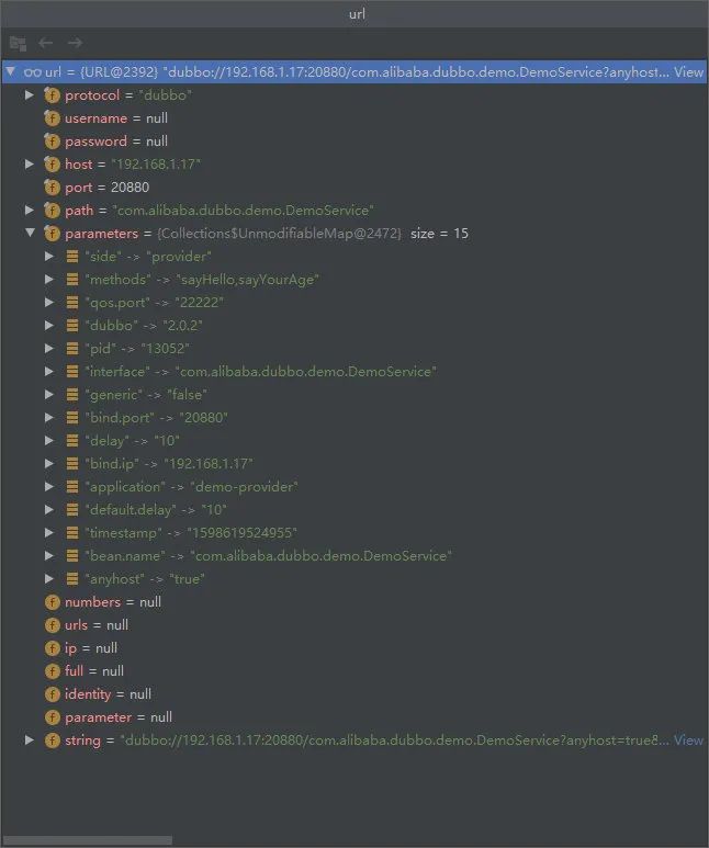 此时构建出来的 URL 长这样,可以看到走得是 dubbo 协议。
