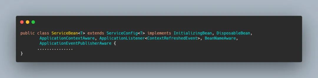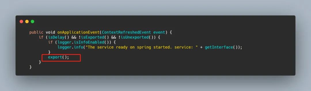 这里又涉及到 Spring 相关内容了,可以看到它实现了 ApplicationListener<ContextRefreshedEvent>,这样就会在 Spring IOC 容器刷新完成后调用 onApplicationEvent 方法,而这个方法里面做的就是服务暴露,这就是服务暴露的启动点。