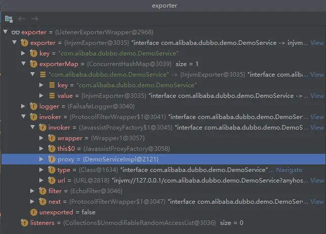 从图中可以看到实际上就是具体实现类层层封装, invoker 其实是由 Javassist 创建的,具体创建过程 proxyFactory.getInvoker 就不做分析了,对 Javassist 有兴趣的同学自行去了解,之后可能会写一篇,至于 dubbo 为什么用 javassist 而不用 jdk 动态代理是因为 javassist 快。