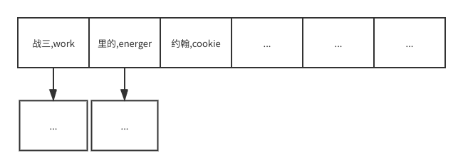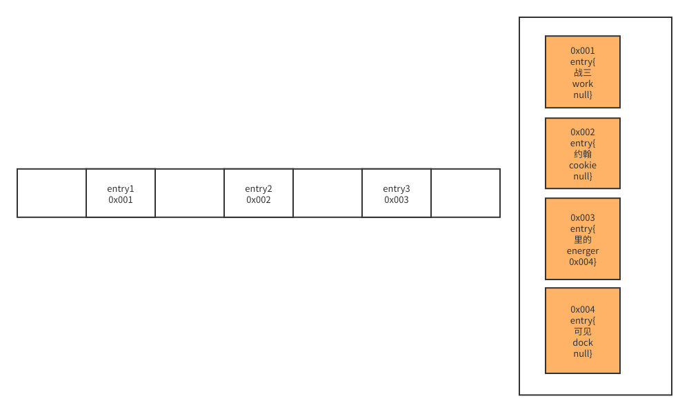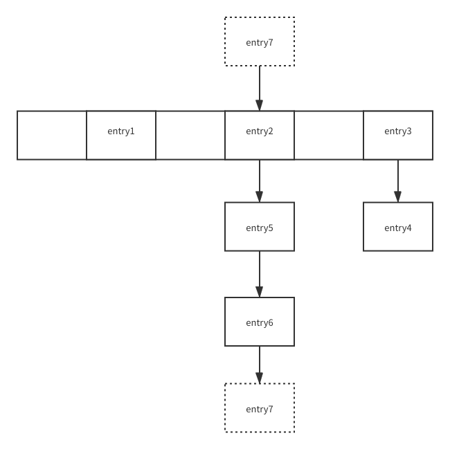 那么在这里所谓的链表就是在逻辑上理解为它们在数组同一个位置,实际上就是先找到数组的这个位置得到了一个entry1然后这个entry1里的next属性引用的就是一个entry2,通过这个entry2的next就能找到entry3。这样的一个链表,基于找到第一个(数组中的entry)然后通过next字段一个一个的引用。下图与上图相对应