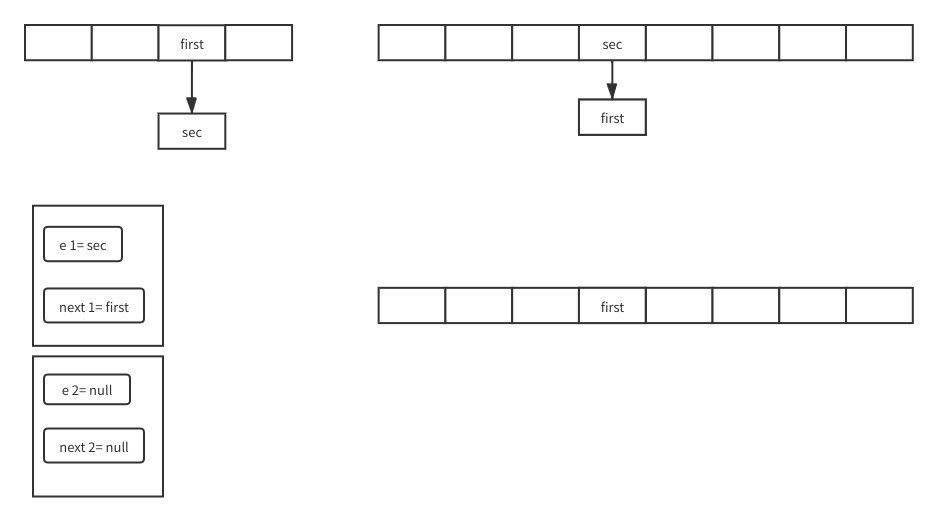 现在新数组就变成图中右下的样子了,可以看到就是sec的next变成first,first的next为空比起原先数组的关系就是反过来的。因为头插嘛第一个先插过去后面的插过去就更靠前第一个就是最下面。接下来e就是sec的next也就是遍历到第三个了然后没有下一个while结束,for循环下一个数组元素。就这样循环往复遍历所有的元素转移到新数组。
