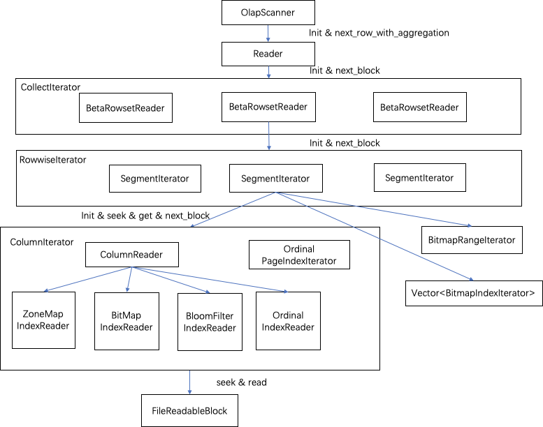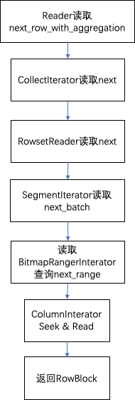 读取流程为写入的逆过程,但读取流程相对复杂些,主要因为进行大量的读取优化。整个读取流程分为两个阶段,一个是init流程,一个是获取next_block数据块的过程。具体过程如下图所示: