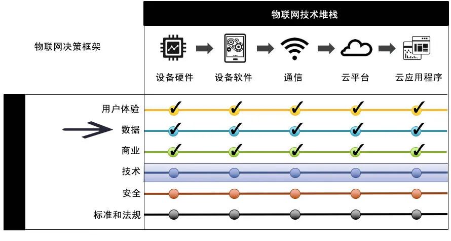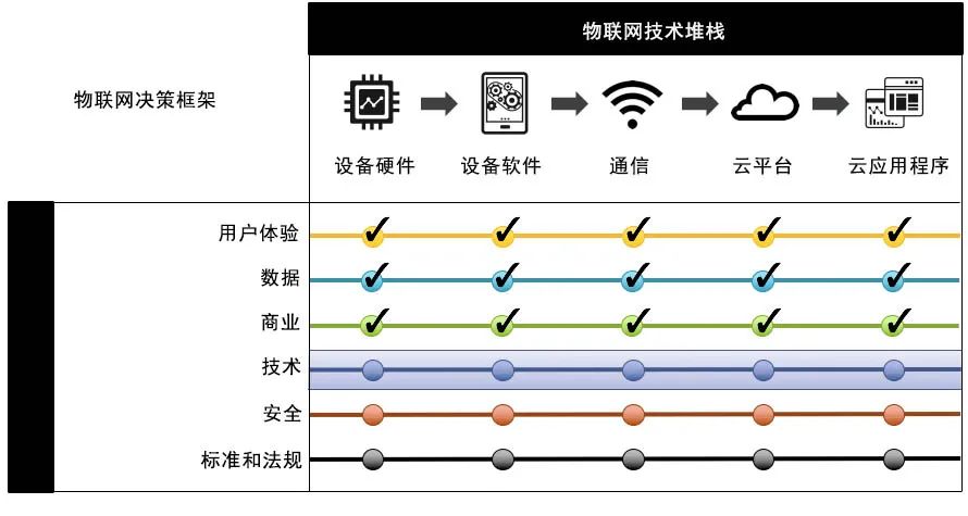 您不仅需要在这五个层中的每一个上做出关键的业务和技术决策,而且还需要确保这无数决策与您的整体策略相一致并且在这五个层中都一致。这成倍地增加了管理物联网产品的难度。为了帮助产品经理解决这种复杂性,我了解到了一个称为IoT决策框架。
