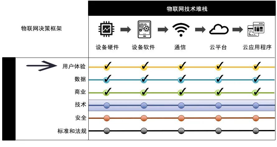每一个决策领域都必须在评估每个物联网技术堆栈层。将从UX开始,然后与您的团队合作,在设备硬件层,然后在设备硬件层等上发现为用户带来出色体验的要素。