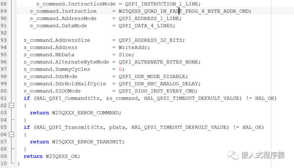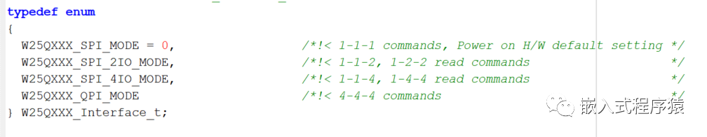 在w25q256.h中定义跟flash相关的数据类型,结构体,宏定义等。如QSPI的操作模式,这里要明白1-1-1,1-1-2,1-1-4,1-4-4等的含义,因为QSPI包含这四种,指令单线,地址单线/4线,数据单线/两线/四线,这些在flash的数据手册指令表里都会标出,支持那种操作,而我们在驱动中要综合考虑这四种。