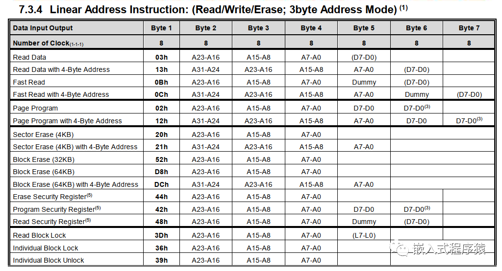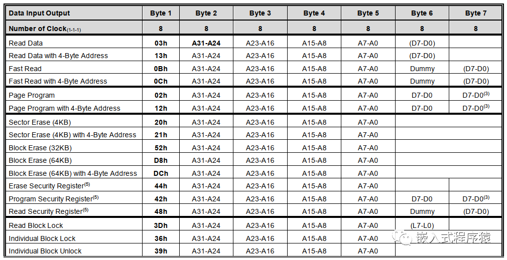 命令表的定义,这个要注意不同型号的FLASH,会稍有区别,即使同一家的不同型号的可能也有区别,如华邦256M和1G的指令就有一些个别的不同。恰好这两款我都用过,在这里给大家提一下。由于指令比较多,这里就不一一列举了,只截取其中一部分,具体指令表的定义可以参考flash手册,