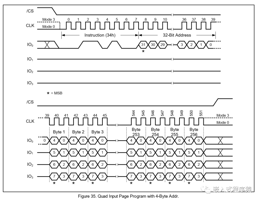 通过时序图可以看到是指令单线,地址单线,数据四线,这样就可以实现写操作了。